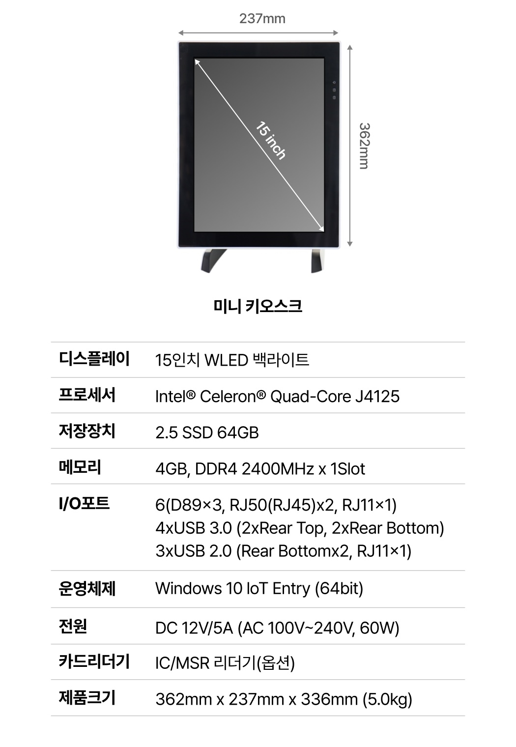 15인치 미니 키오스크 + 토스프론트 전체 제품 사양